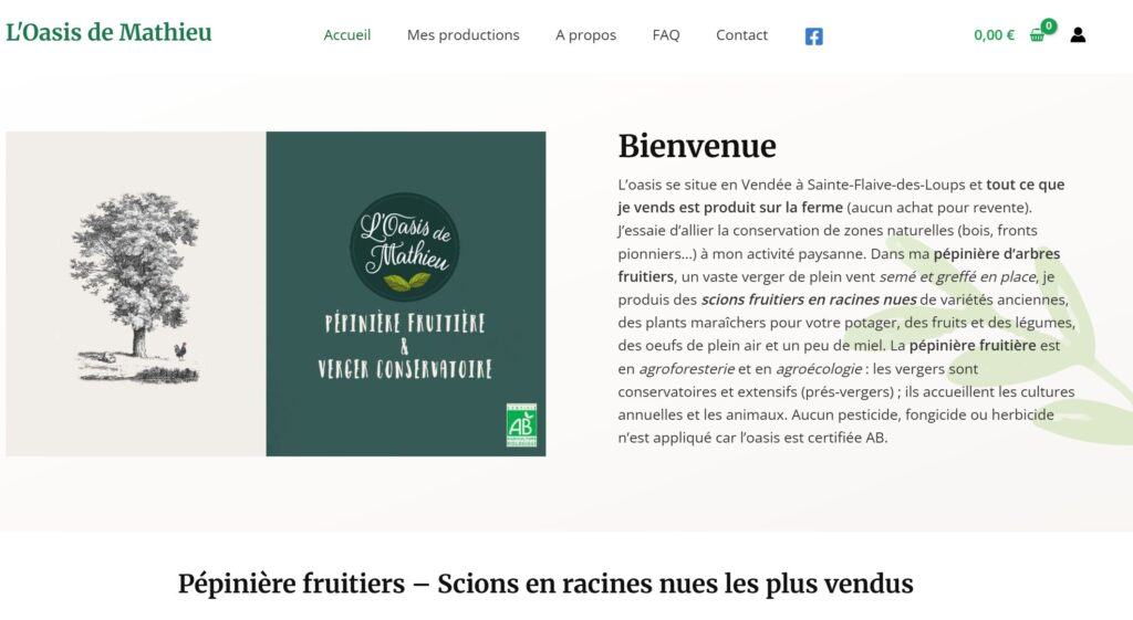 Notre mission pour ce projet était de créer un outil de vente en ligne clair et fonctionnel, adapté aux deux types de clientèle que Mathieu sert. Les scions fruitiers sont disponibles à la commande avec livraison en France métropolitaine (à partir de 10 unités), tandis que les surplus maraîchers sont proposés en retrait direct à la ferme.